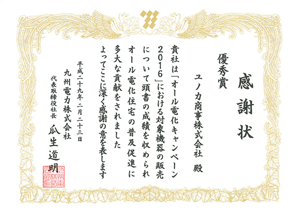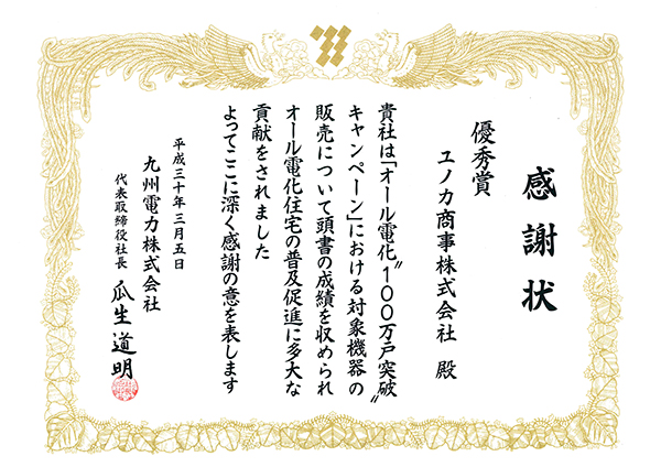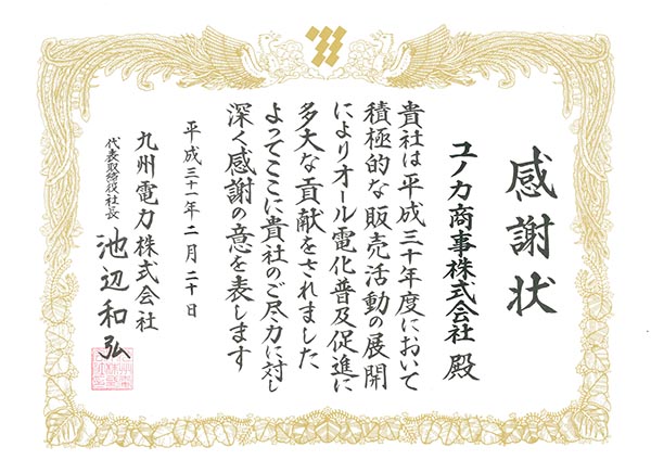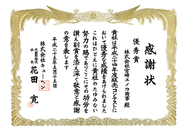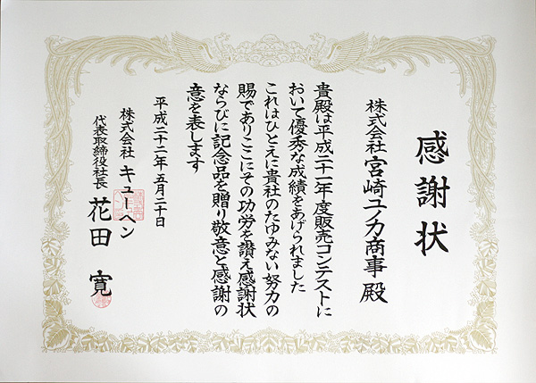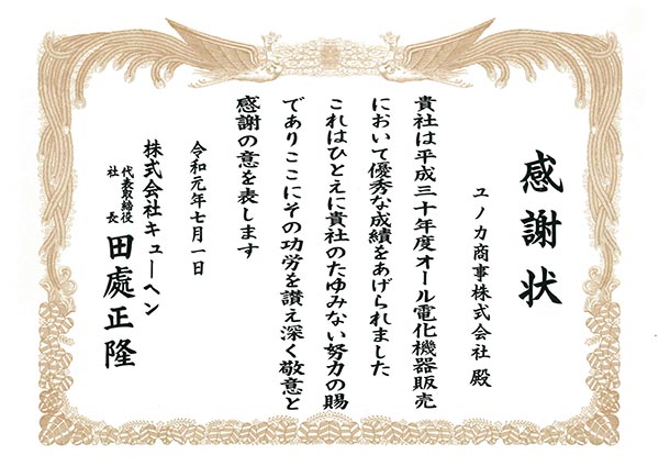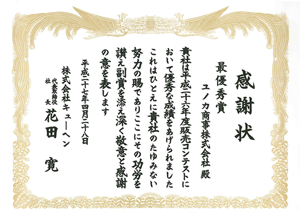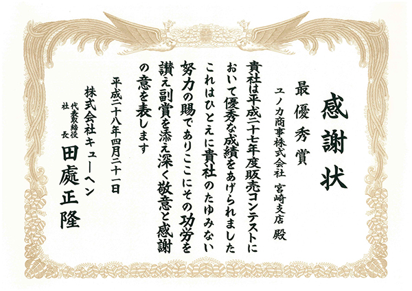 令和元年7月1日の販売コンテストにおいて「平成30年度 最優秀賞」という栄えある賞を頂きました。